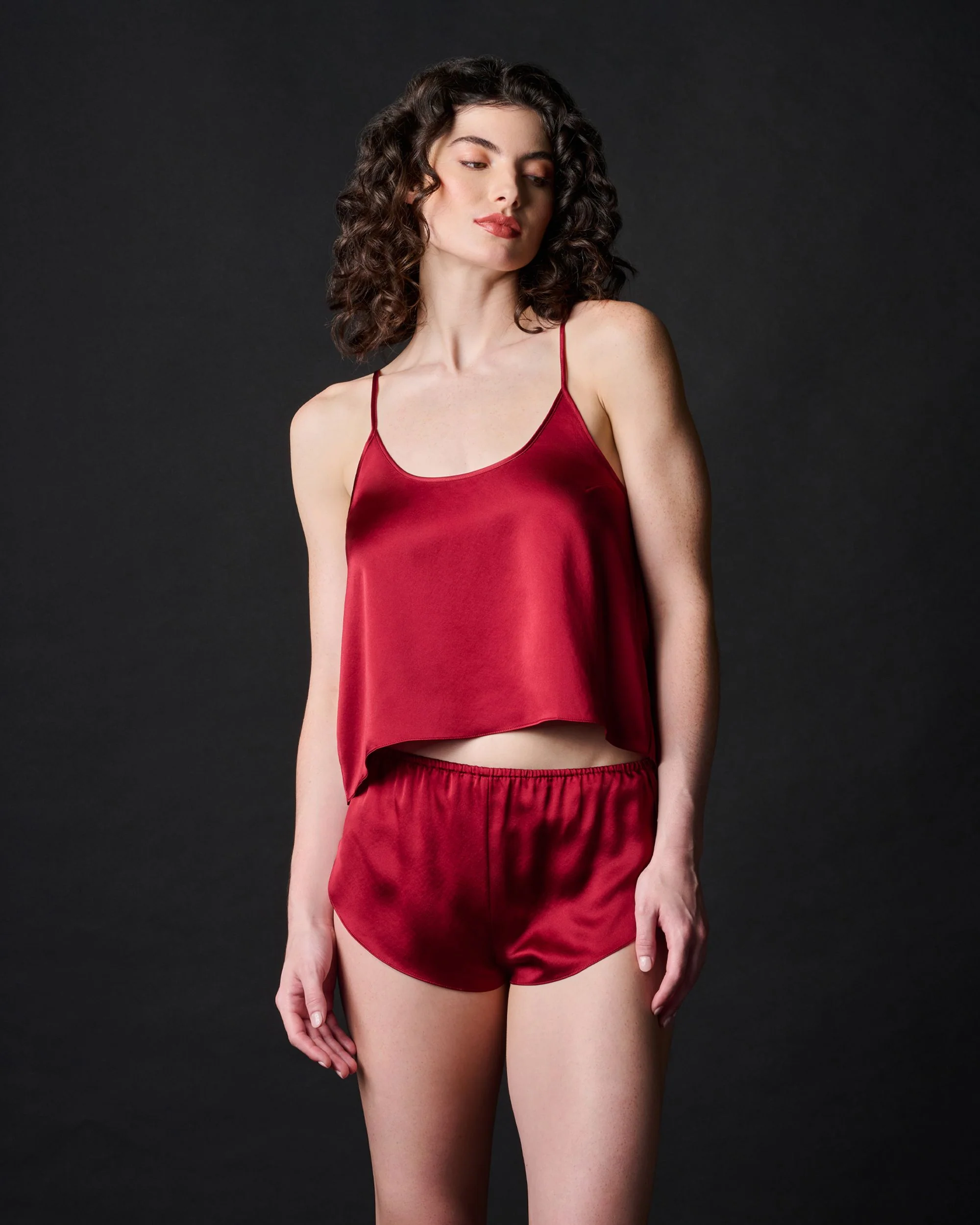 A simple but stunning sleepwear silk cami. The Journelle Celine Open Back Cami is perfect to lounge at home, or pair with jeans to wear out. The layered back allows for movement, showing off a subtle and sexy open back. Slightly cropped cut to perfectly skim the matching Journelle Celine Tulip Shortie.