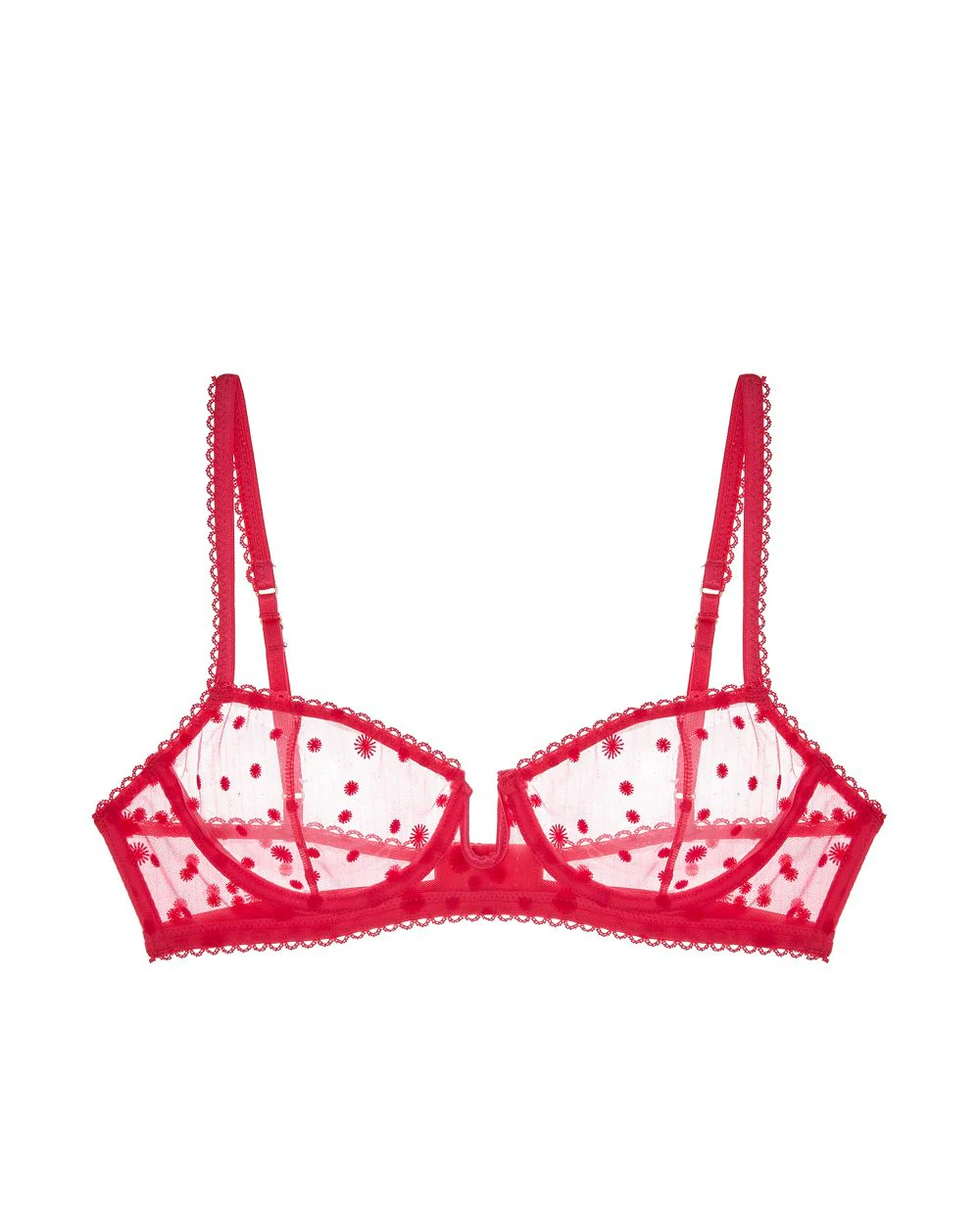 Brighten your day with a pop of pink in this playful style. The sheer mesh demi-cup bra dazzles with a funky pattern and silk trim. With a striking U-shaped underwire, this piece will have you seeing stars.