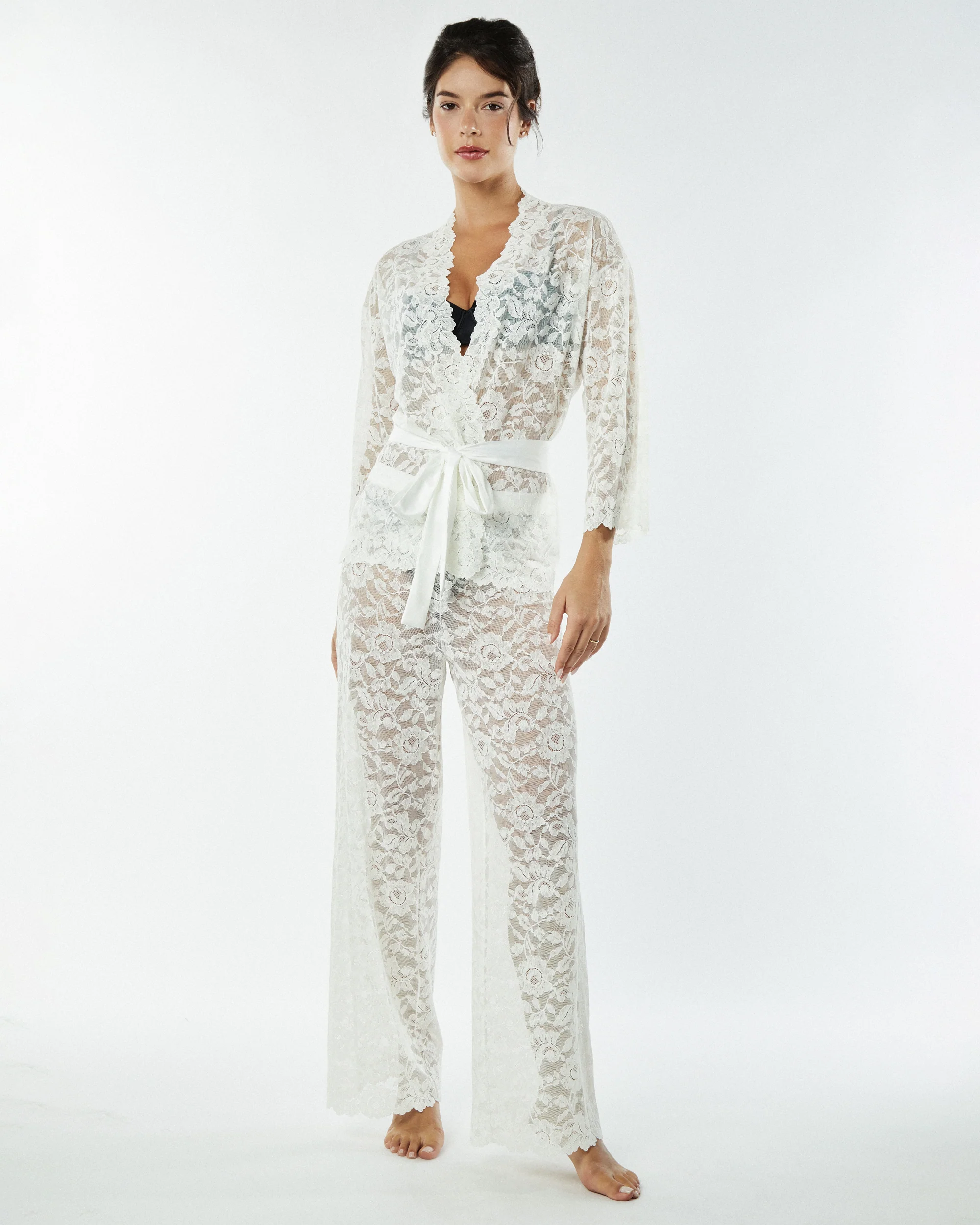 The essential allover lace wrap from Natori with allover sheer lace, satin belt, and exclusive peony lace.